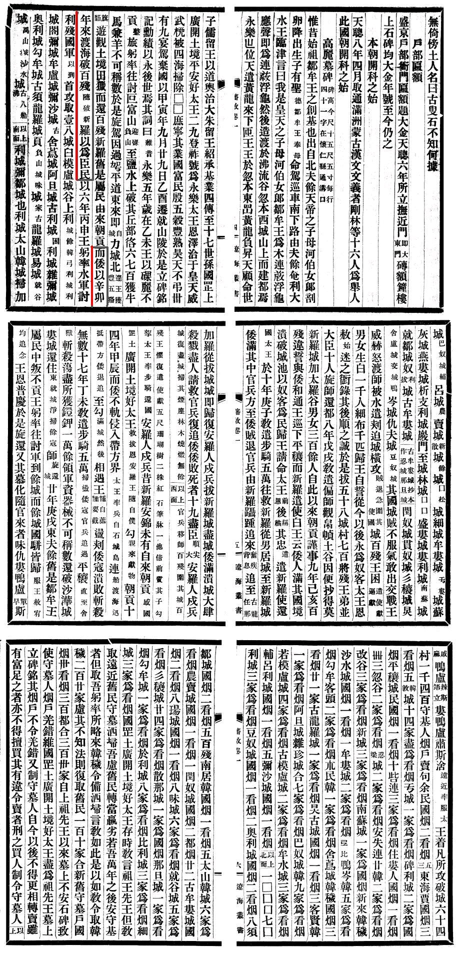 百殘新羅舊是屬民由來朝貢而倭以辛卯年來渡海破百殘隨破新羅以爲臣民(百殘・新羅は旧(もと)是(これ)(高句麗の)属民にして(高句麗に)朝貢す。而(しか)るに、倭、辛卯年(しんぼうねん;西暦391年)を以(もっ)て渡海し、百殘を破りて随(したが)え、新羅をも破り、以て臣民と為(な)す)