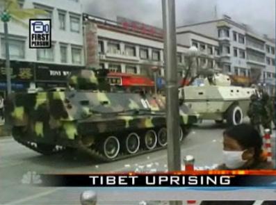 今年(2008年)3月以来、西蔵(チベット)自治区をはじめとする「中国」国内の各省で頻発しているチベット民族による様々な「蹶起(けっき)」(私は「中国」が主張する「暴動」と言う語を使わない)の様子が、非「中国」系メディアから流れてきますが、その多くがデモ行進であったり、武装警察や軍等の鎮圧部隊への「投石」であったり、棒等を使った建物に対する硝子(ガラス)の破壊であったりと言った具合で、その「装備」の貧弱さには目を疑うばかりです。相手(鎮圧部隊)は重火器はおろか最新鋭の重装甲車(右写真:米NBC)迄投入している事を考えると、正に「決死の覚悟」での「蹶起」であった事が伺えます。(実際、多くの死傷者が出ている) 尤(もっと)も、刀やピストルに素手で対抗する様なものですから、あっと言う間に鎮圧されてしまうのは目に見えており、現に「蹶起」は「中国」の力(武力)の前にあっさりと潰え去ってしまいました。然(しか)し、その「副産物」は余りにも大きく、チベット民族はある意味で「大きな戦果」を上げたと見る事が出来ます。