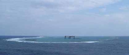 | 西側から見た「沖ノ鳥島」の全景 左手前が北露岩、右隣奥が東露岩、中央に観測施設、右側に水路がある。 (すてら氏『船・船旅 その魅力』内「沖ノ鳥島写真館」より) |